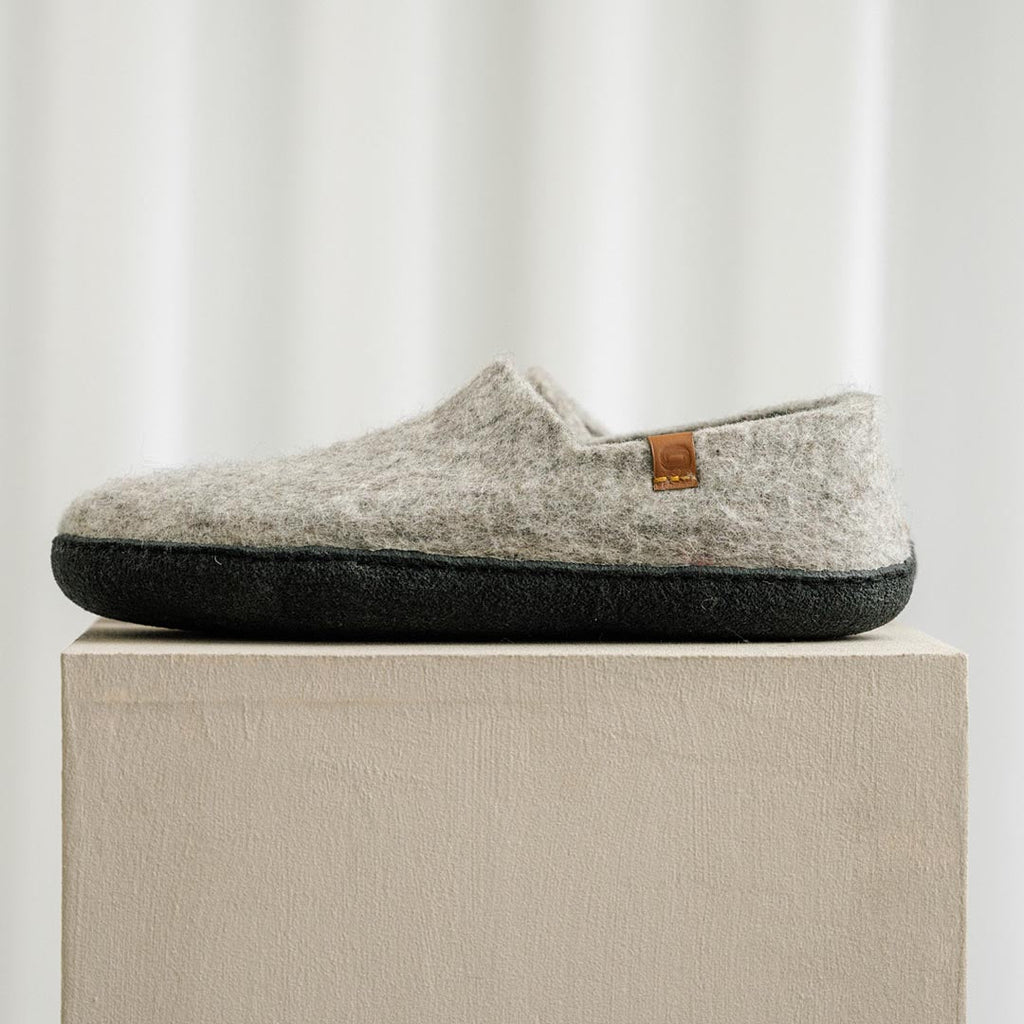 Vi tror også på, at vi kan klæ' os behageligt og smukt uden at belaste miljøet. Derfor anvender vi kun naturlige materialer, som kan høstes fra naturen, og gives tilbage til naturens eget kredsløb. Overdelen består af 100% ren naturlig uld, mens sålen er af ren naturgummi.