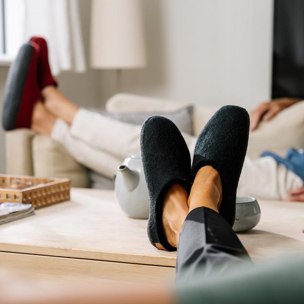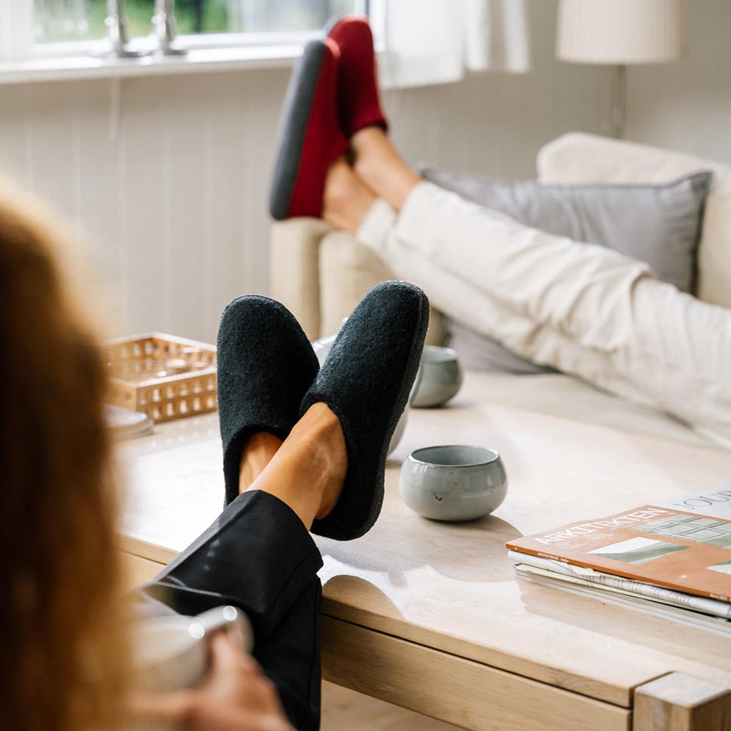Det naturlige indhold af lanolin beskytter hvert enkelt uldfiber mod snavs og lugt. Derfor anbefaler vi at bruge uldne filtsko uden strømper.